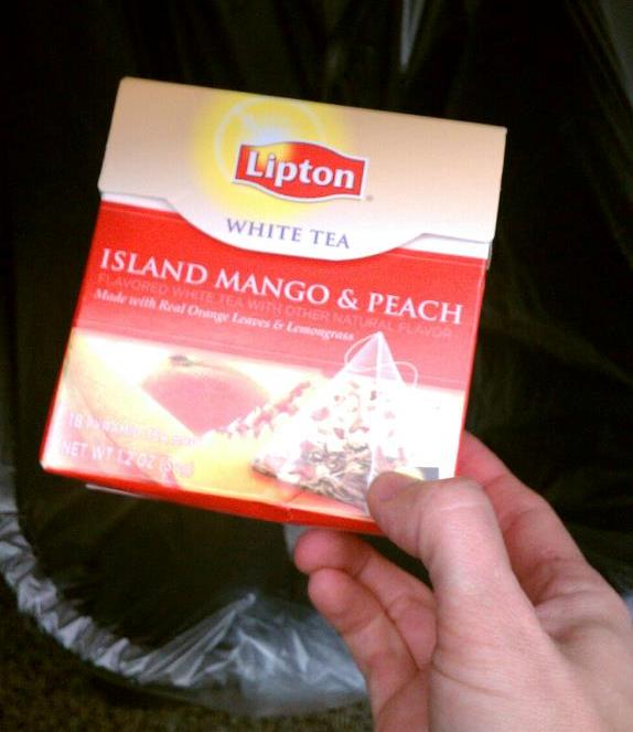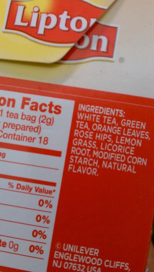Yesterday afternoon I was craving something sweet, so I decided I would make myself a cup of tea with Stevia. I had brought from home and kept at my desk, Island Mango and Peach Tea, which sounded good for a change. Not sure what prompted me to look at the ingredients (because you know, tea is made from TEA LEAVES), but I did, and much to my shock and disappointment (in Lipton), one ingredient was modified corn starch! Corn is a grain, why do I need grain in my tea? I don’t.