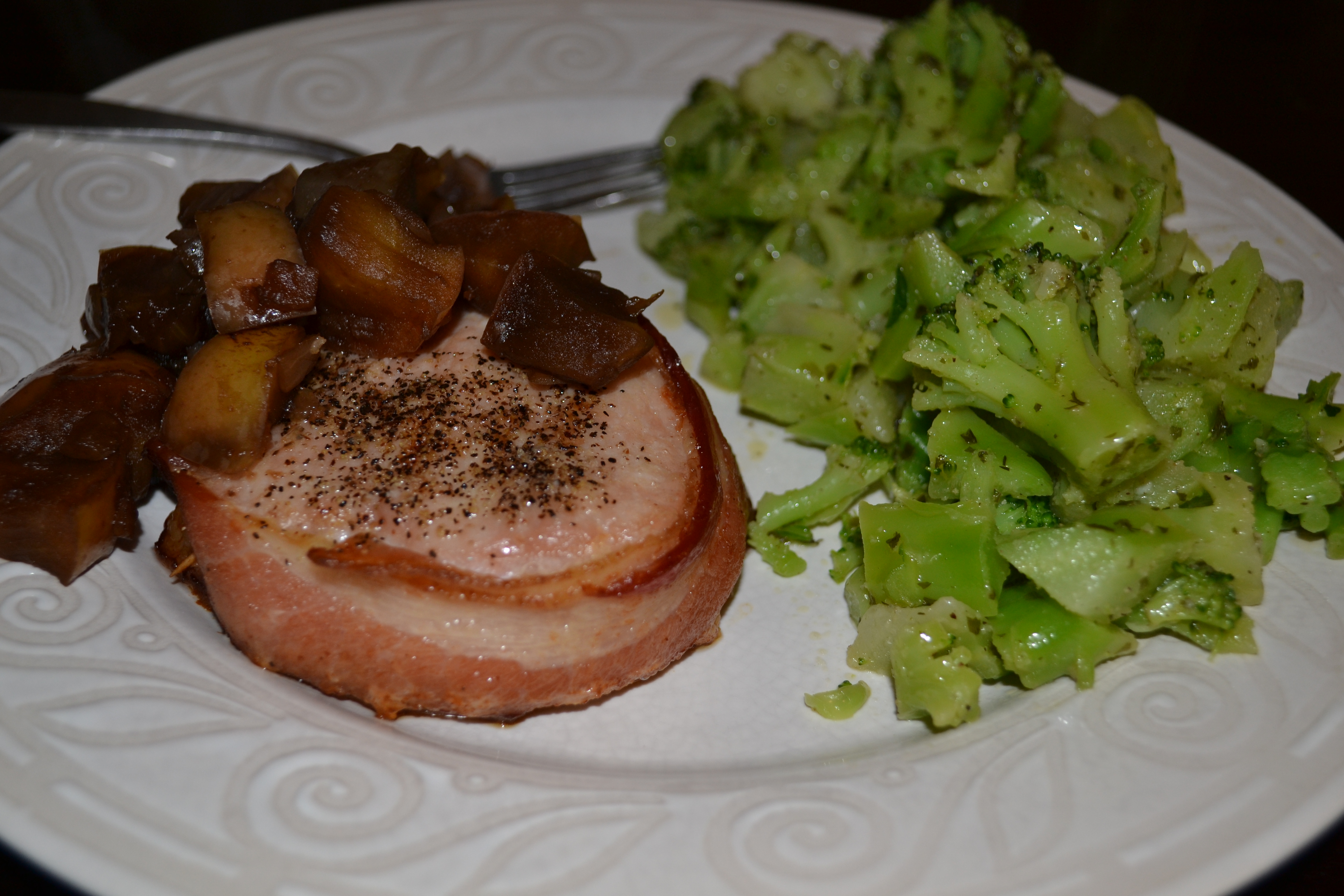 As you know, I’m all about keeping it simple, and more so, using what I have on hand or what needs to be used. This dinner, is the perfect example of that: Bacon wrapped pork chops with apple balsamic compote, accompanied by garlic buttered broccoli (seen here: http://wp.me/p2zSoO-bk).