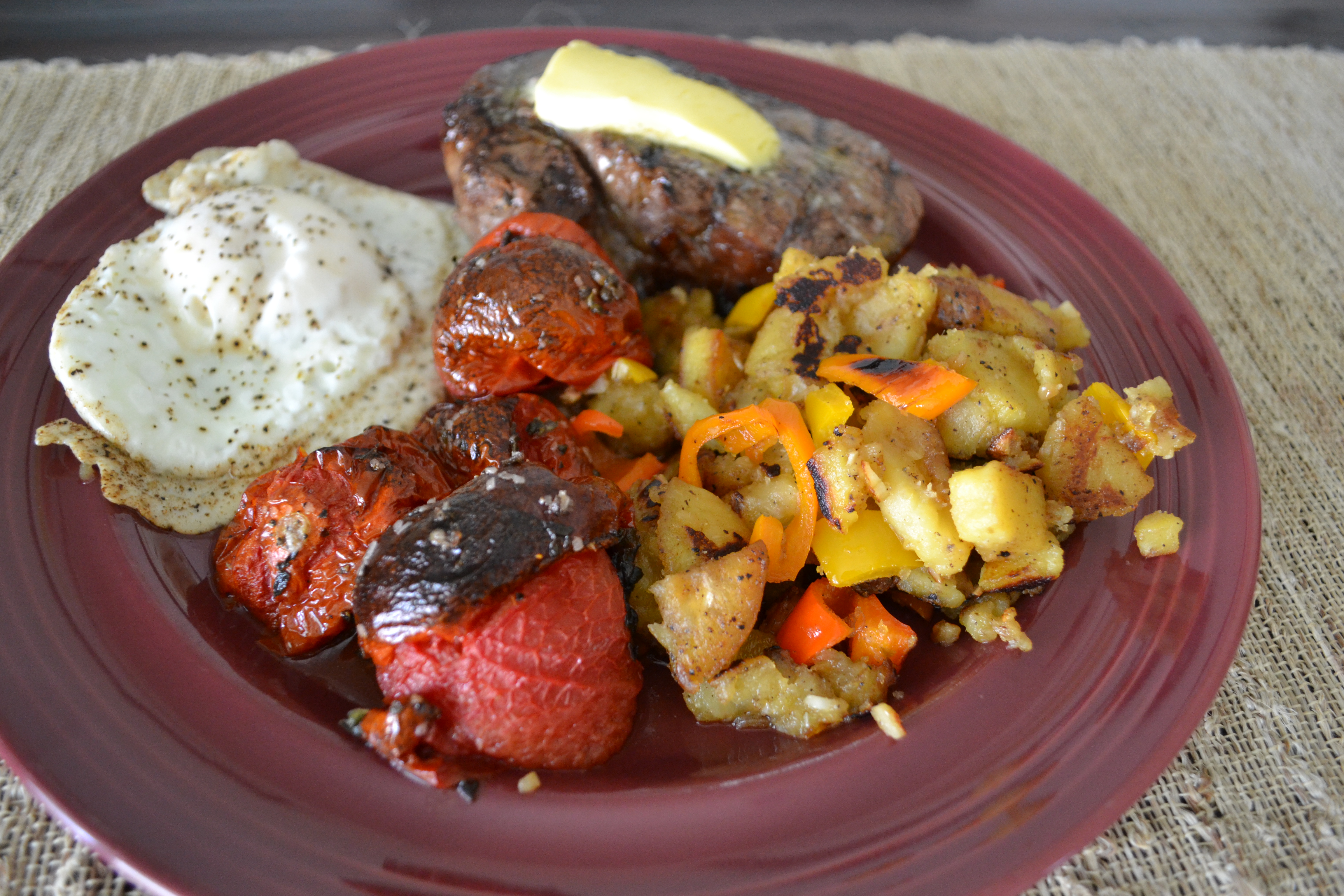 Steaks (hers: filet w/grass-fed butter, his: NY Strip w/Worcestershire), one over-medium egg, sweet potato and pepper hash (that’s the first time he’s added bell pepper to his sweet potato hash, nomnomnom), and oven-burst campari tomatoes.
