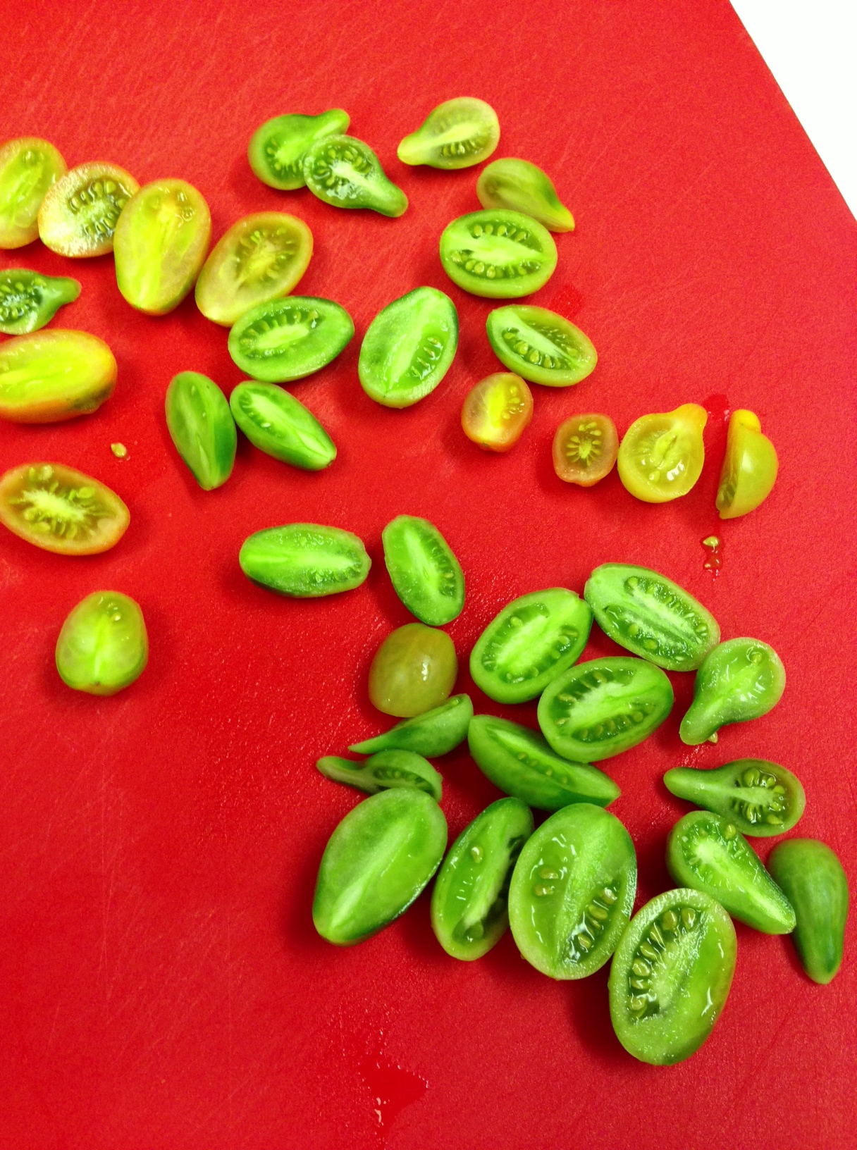 I can’t waste food, and if something does get by me, I feel horrible. I especially can’t let anything I grow go to waste. The last time Seth and I re-staked the garden, there were quite a few green Roma/Grape casualties. I decided I would go ahead and pick them up, while I was picking the ripe ones, too.