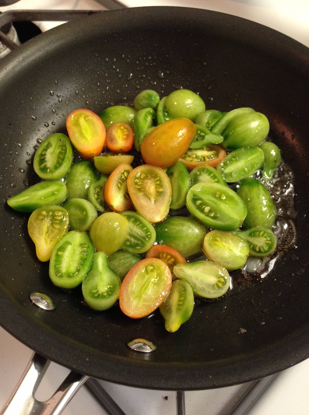 Heat a couple TBSP of reserved bacon fat in a skillet until liquid, and add halved green tomatoes. Season with spices, let sizzle for 10 minutes or so. Eat. Try not to inhale. You could substitute for coconut oil if you don’t want the bacon fat. Best thing about green tomatoes is they don’t get mushy or soupy.photo 1 (7) photo 3 (2)photo 1 (8)