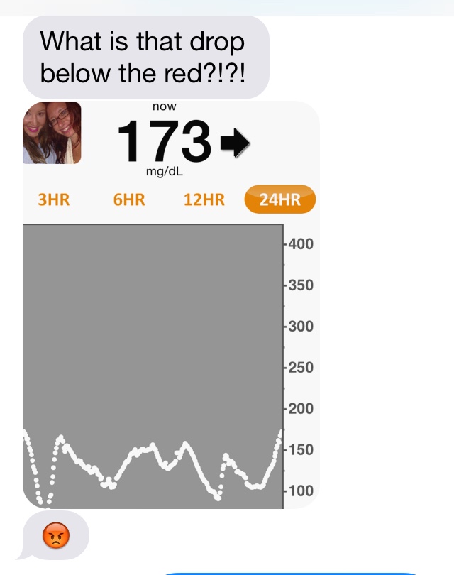 Then, I’m laying on the couch last night with my ankle elevated (long story) and all of a sudden boom, my heart is racing and I’m really hot. I think, hmph I should probably test my bg. Sure enough, 54. That’s the lowest low I have had in probably 1 1/2 years? I have maybe 1 low per month anymore. I went into the kitchen, treated, and then came back to elevate my ankle some more. I said to Seth, “it’s really hard to not walk into the kitchen, inhale everything in it, and then curl up in a ball and go to sleep and not wake up.” This has always been the best way for me to attempt describing my cognitive thoughts when I’m low – I literally want to curl up and go to sleep, and not wake up 😦 Doesn’t happen often, but it is the worst feeling in the world.