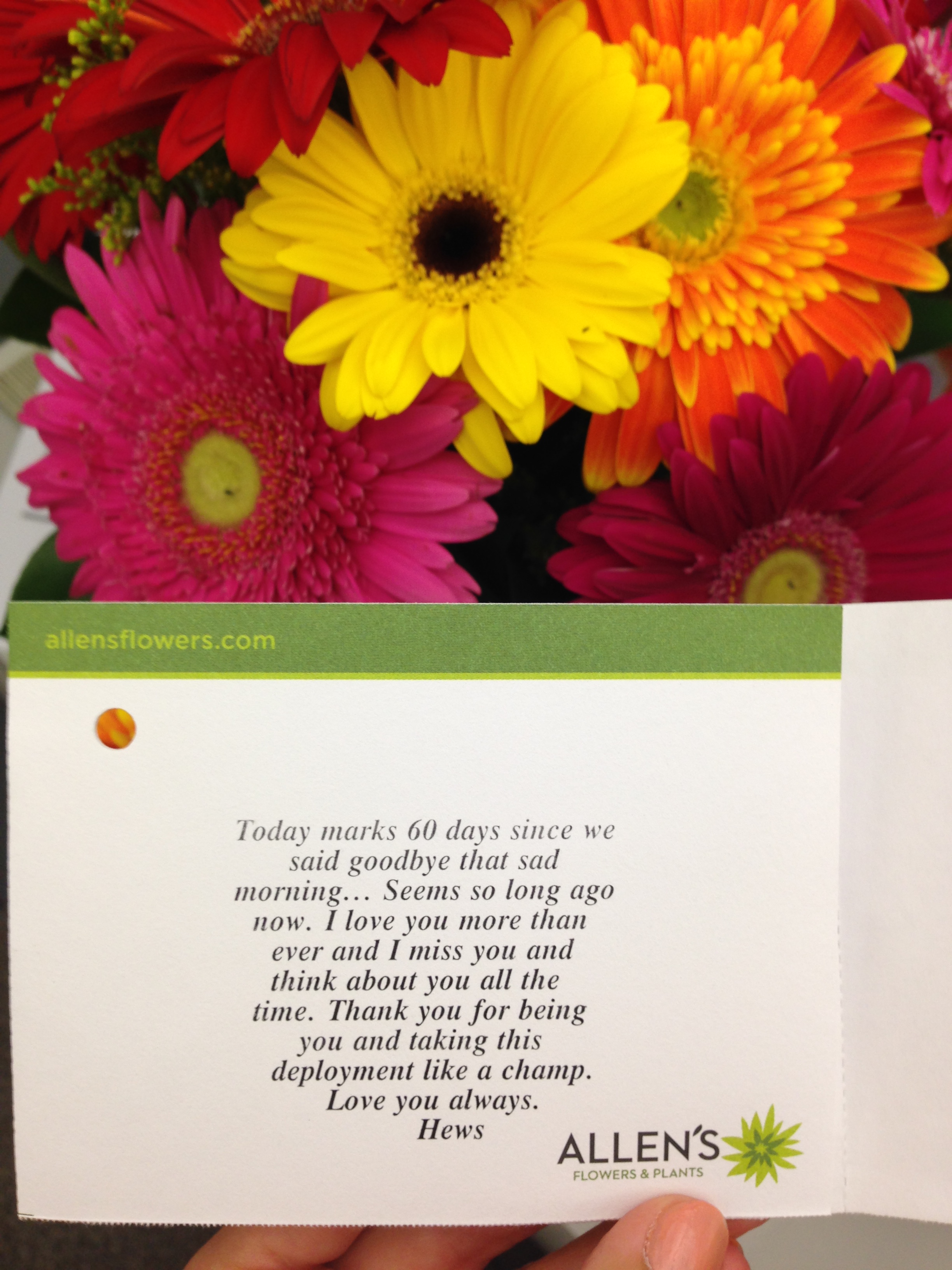 My husband and I celebrate 60 days into this deployment we’re in, and he remembered this and sent me the most gorgeous bouquet of gerbera daisies I have ever seen, with the most beautifully written card.IMG_7609[1]