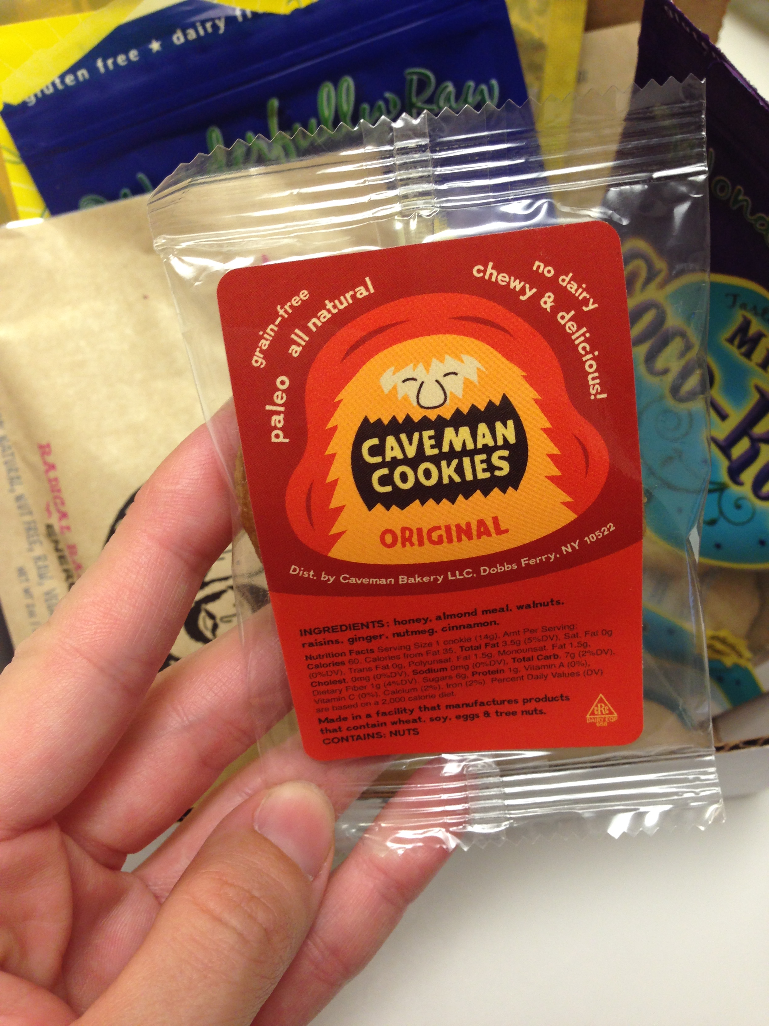 The box included an information card highlighting the features of each product. My absolute favorite part about this snack box is that not only is it convenient, it included several paleo-friendly/primal-friendly small companies that I’d never heard of, that clearly make food with quality ingredients. I LOVED trying the Bearded Brothers energy bars – and will definitely purchase them in the future, they were like a flavorful, gooey little fig newton bar, score! I’d also never heard of Sophia’s Survival Food Jerky Chews, and they’re exactly what you’d want in grass-fed jerky! I really liked that they’re in bite-size pieces so as not to kill my teeth ripping the jerky apart (although this would be very cave-esque). I have always been a fan of Coco-Roons, but hadn’t had the miniature size, perfect for a quick bite-size snack, and we keep Caveman Cookies in the house regularly!