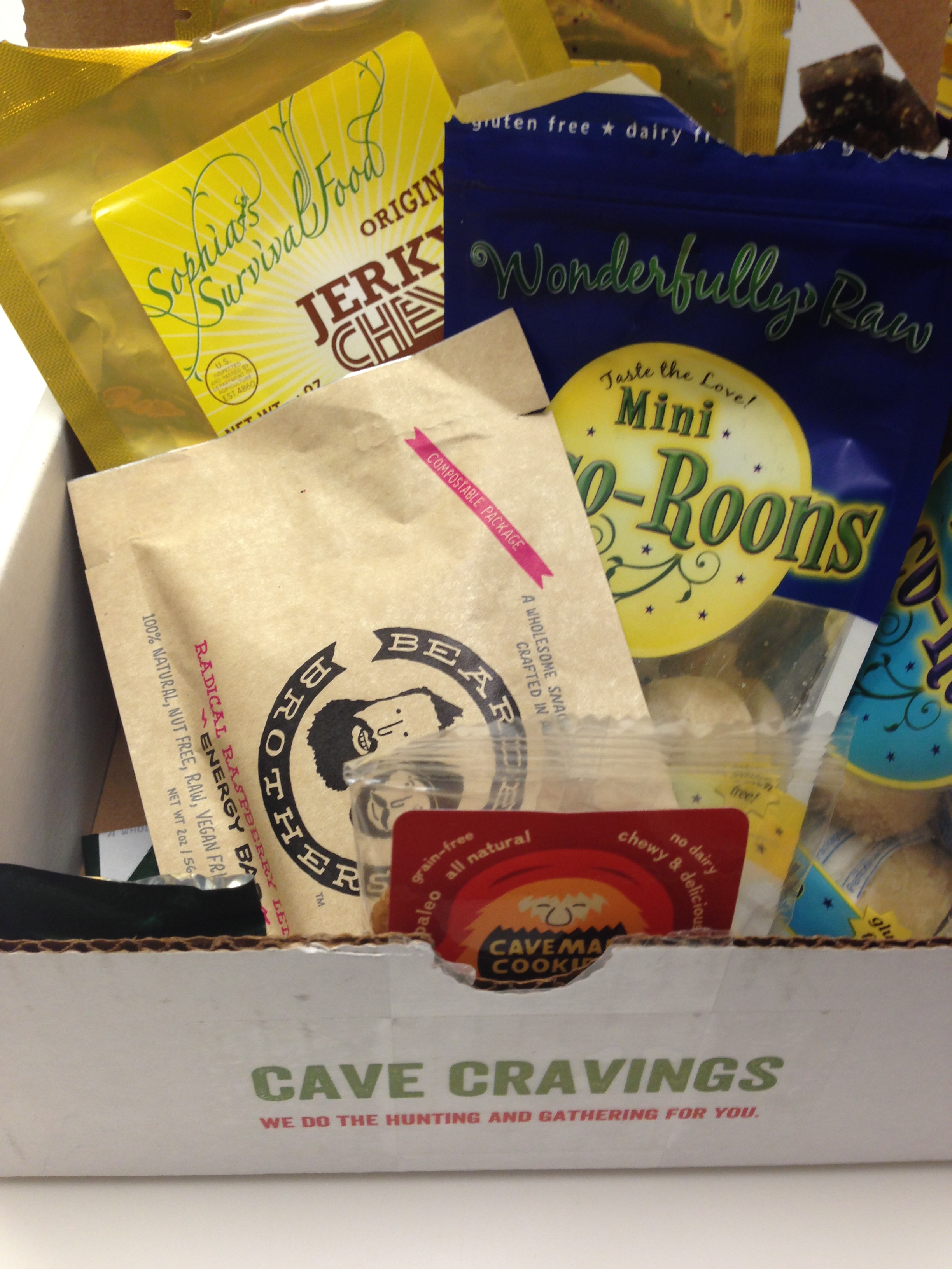 Inside: two packages of Miniature Coco-Roons from Wonderfully Raw, Lemon Pie and Vanilla Maple, two packages of Sophia’s Survival Food Jerky Chews, Original and Mild, 2 Bearded Brothers energy bars in Radical Raspberry Lemon and 2 Bearded Brothers Chews, 1 in Ginger Peach and 1 in Maca Chcoloate and 2 Original Caveman Cookies.