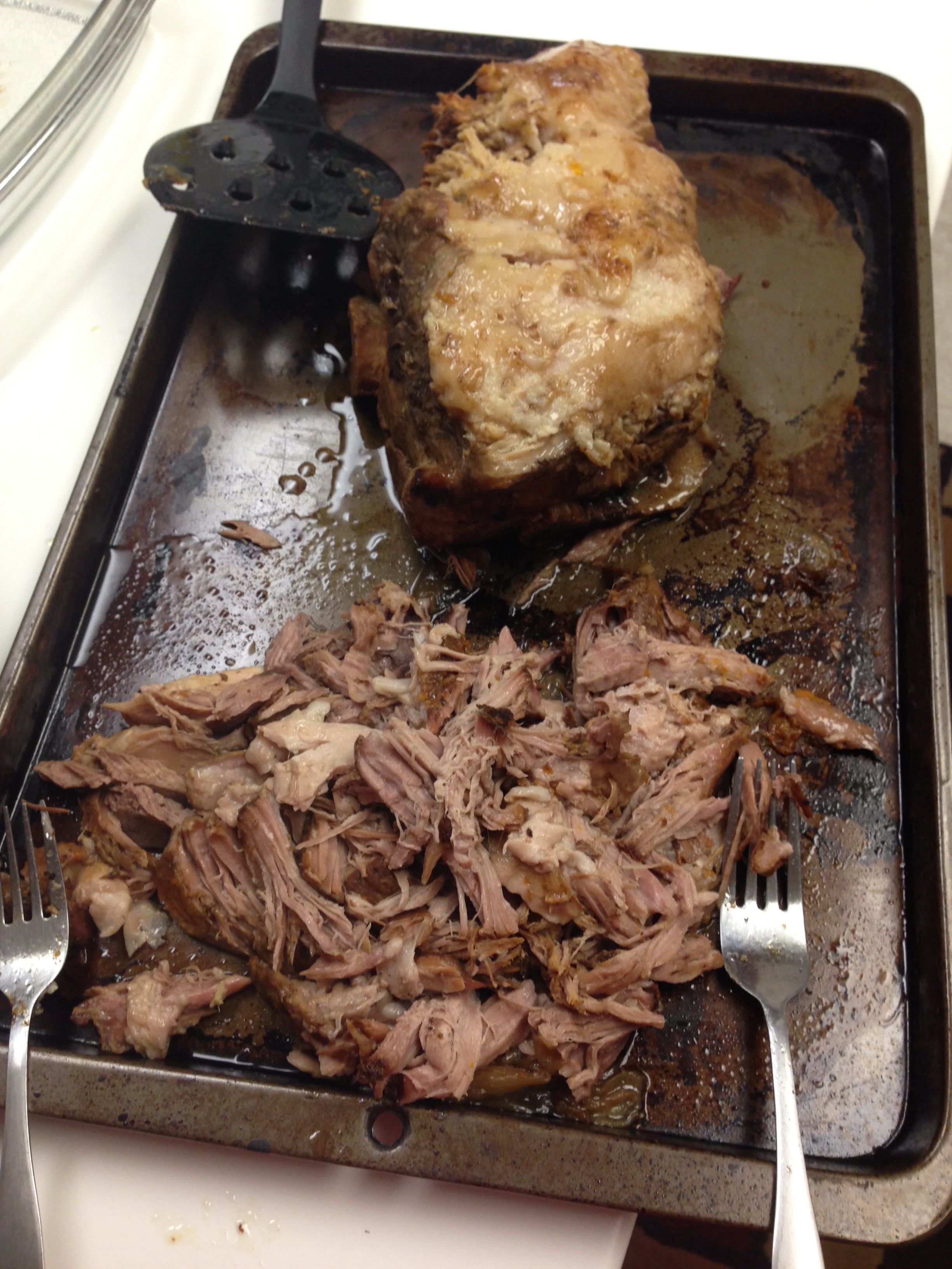 The meat I used this time was a combination 1/2 and 1/2 pork shoulder/pork butt wrapped together in netting (the butt was pretty fatty, YUM). I left the netting intact for cooking and generously coated the meat in salt and pepper, then sprinkled with the remaining spices: cumin, smoked paprika and crushed red pepper. Place the meat in the crockpot and squeeze the juice of 1/2 the orange over the top of the meat, then add all remaining ingredients. I set it on high for about 2 hours until it was boiling and then turned it down to low for a couple hours. I then flipped it and brought it back up to a boil on the other side, then turned it back down to low for another hour or so. Total time was about 6-7hrs. Then I cut the netting off and shredded the meat for dinner. We made carnitas bowls with all of our favorite fixings (cilantro, lime wedges, avocado, tomato, raw red onion, sliced green olive, hot sauce, salsa, cabbage, etc.).