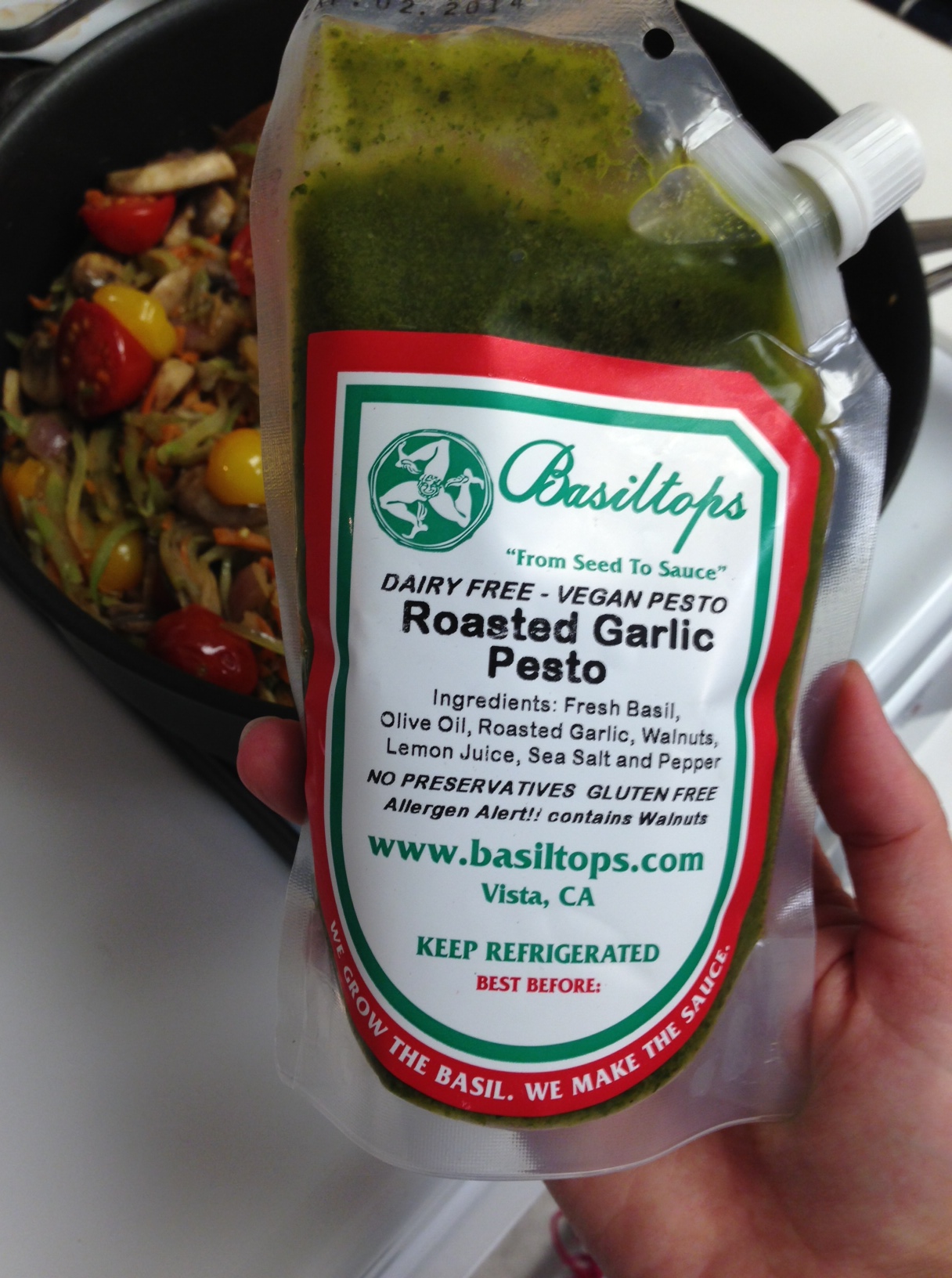 I sautéed the onion in about a TBSP of coconut oil. Once the onion started to soften, I added the bag of broccoli slaw, and seasoned with a little salt/pepper/garlic powder. I continued sautéing until everything was hot, and at the last-minute added the mushrooms and tomatoes (since they’re soft and I didn’t want them mushy). Last, I topped with a garlic vegan pesto I found at the Hillcrest Farmers Market a week ago. If your eyes were closed, you’d think you’d have a giant bowl of pasta with sauce in front of you. Will definitely make again, and again.