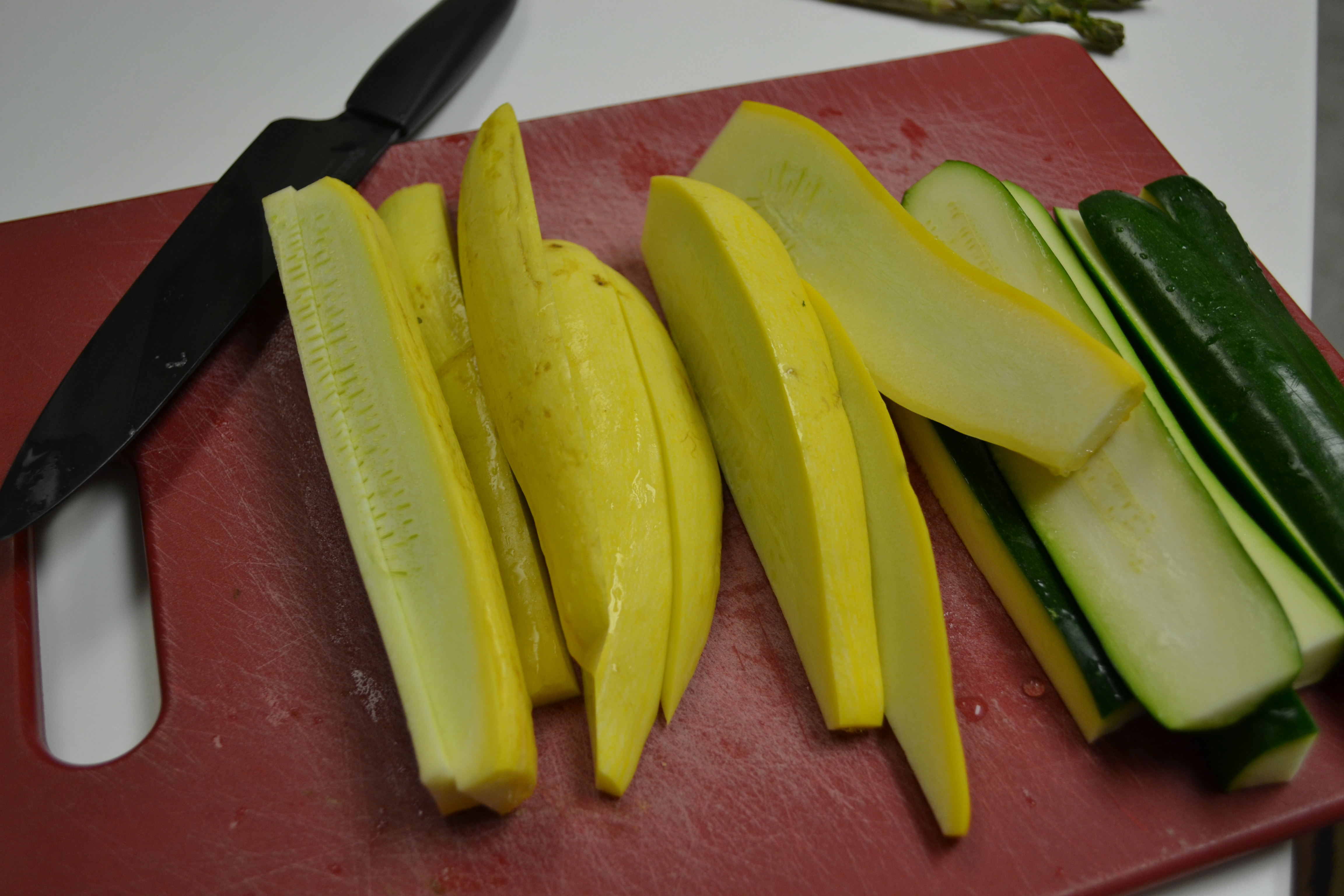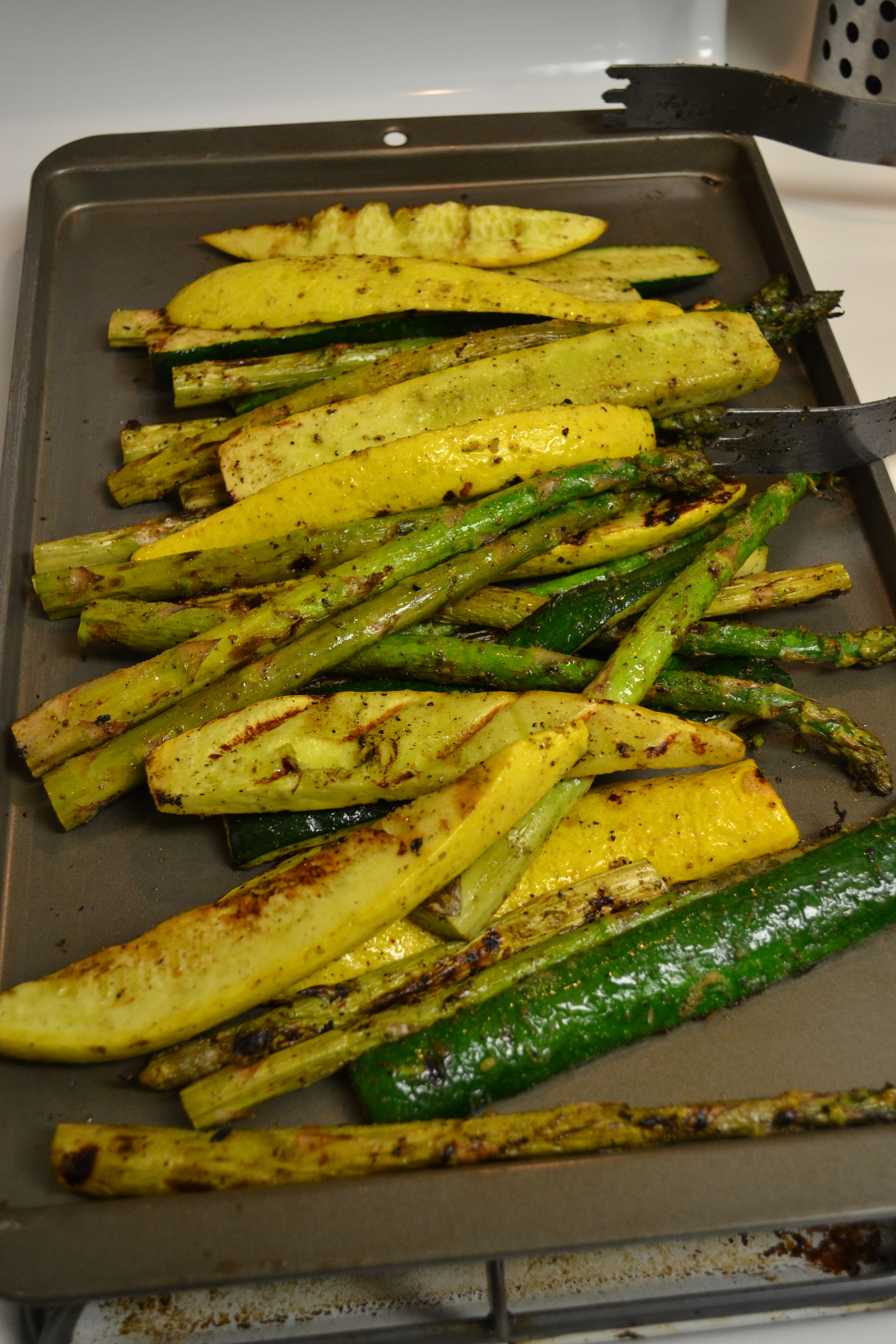 Slice zucchini in long spears, toss in a bag, drizzle with a little oil, salt, pepper, garlic (or whatever you prefer). Shake around/massage, dump on grill, move around for about 8 minutes so they don’t burn but get the good sear marks, remove and serve. I love grilled veggies, but not when they’re mushy 🙂