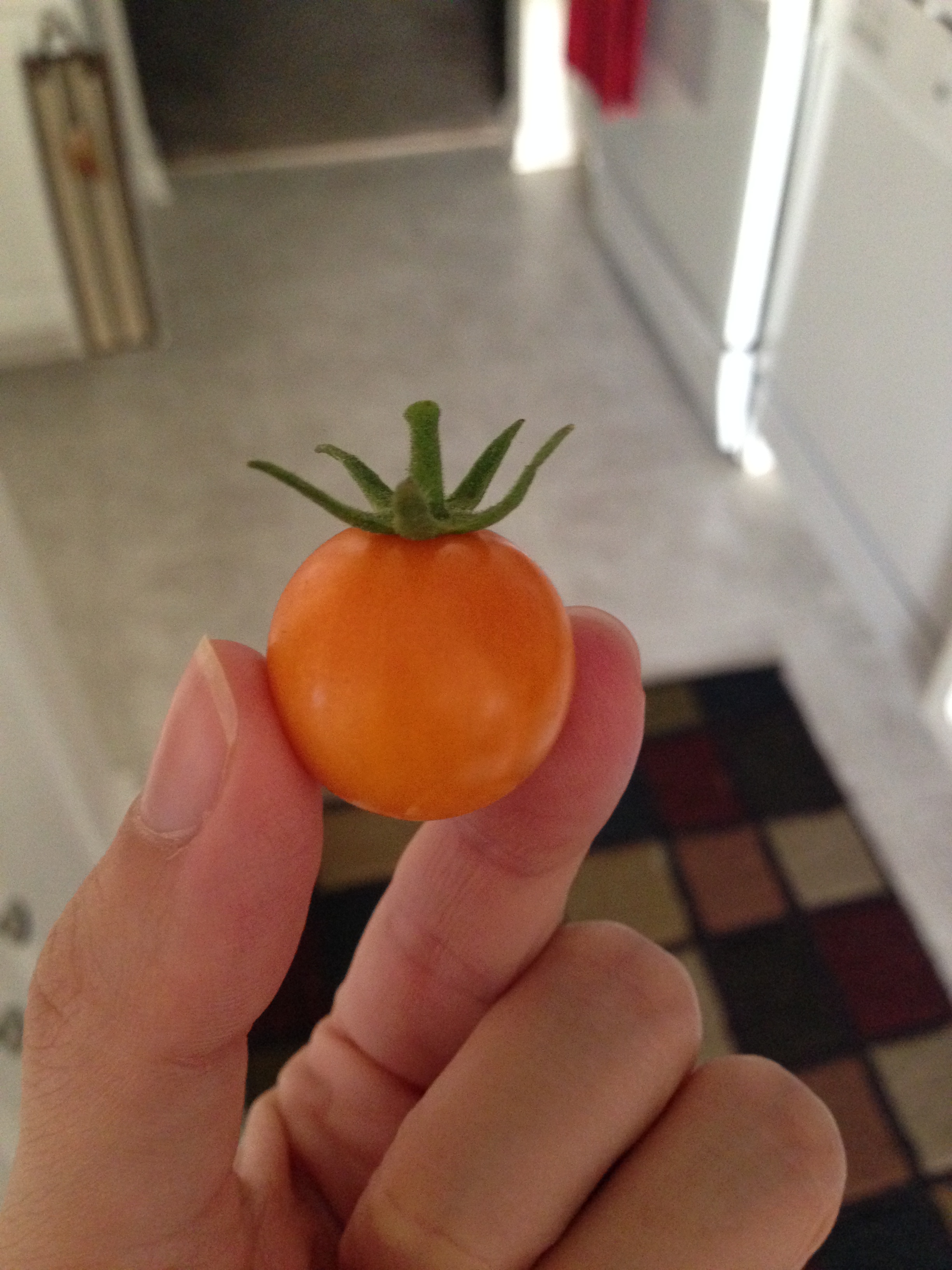 One of the tomato plants I planted this year is a “Sun Sugar Cherry” plant (each year, I kind of just pick 5/6 different kinds and see what I end up with-however, this one will be planted every year). Little orange cherry tomatoes, that are, surprisingly sweet and flavorful. In fact, after I picked them last night I tried one, and then I had quite a few more (fun fact: several years ago, Sun Sugar was named by Sunset Magazine as the best tasting tomato in their trials for its sweetness and rich tomato flavor that includes just the right amount of tartness!). Probably the best cherry tomato I’ve ever had. I decided to throw together a salad with ingredients I had at home, and it turned out to be fabulous!