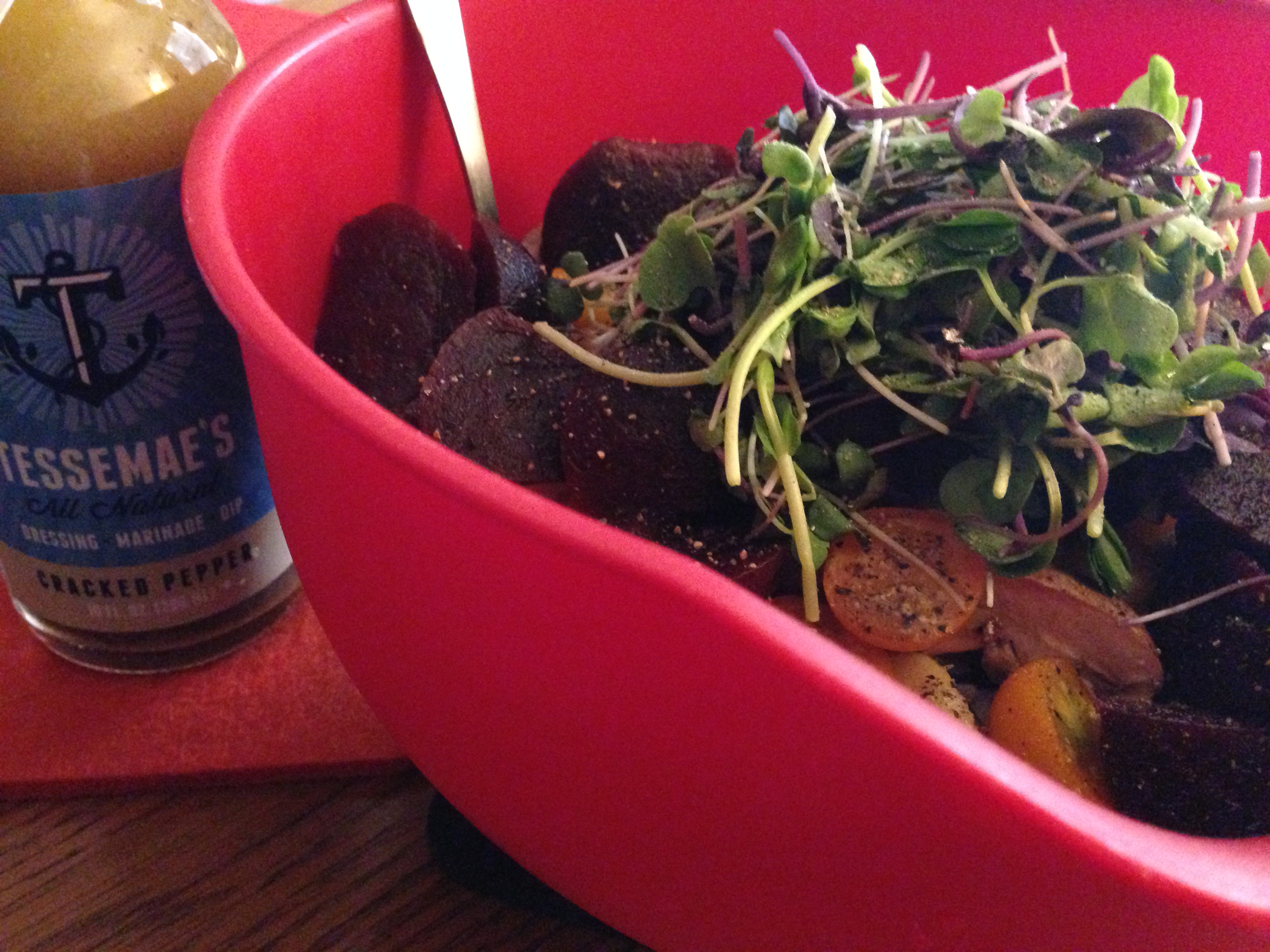 Toss everything in the bowl, and top with a handful of microgreens, salt/pepper and some Tessemae’s (paleo friendly!) Cracked Pepper dressing.